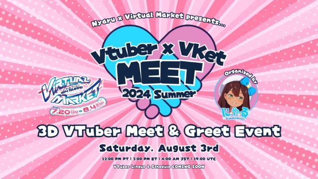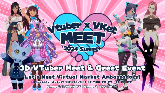VTuber x VKet MEET is an collaborative initiative started by Nyaru (nyaruchuuu), VKet Ambassador and VTuber, and Virtual Market to give VTubers and Avatar Streamers a 3D space for Meet & Greets during Virtual Market Events in VRChat.